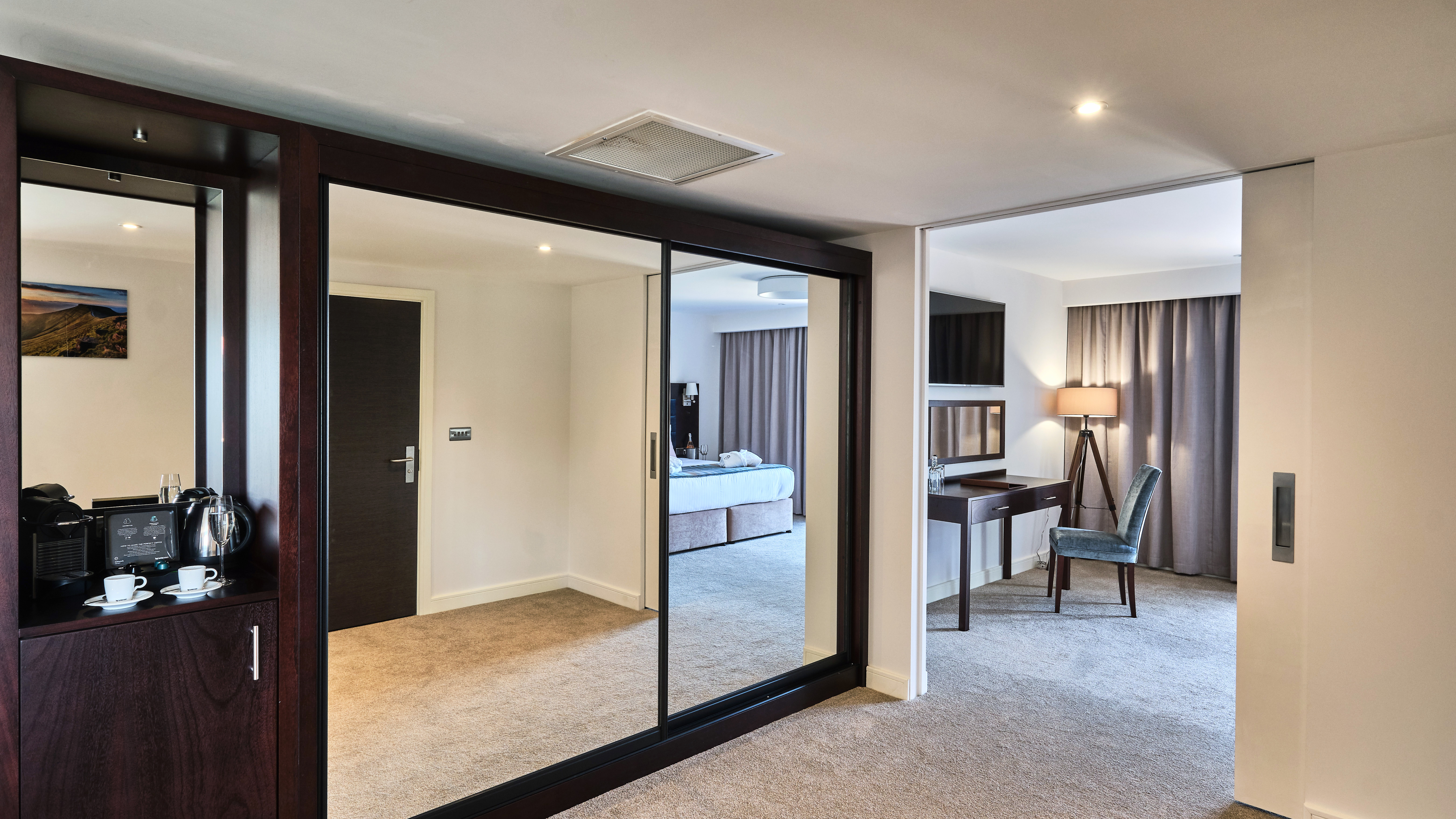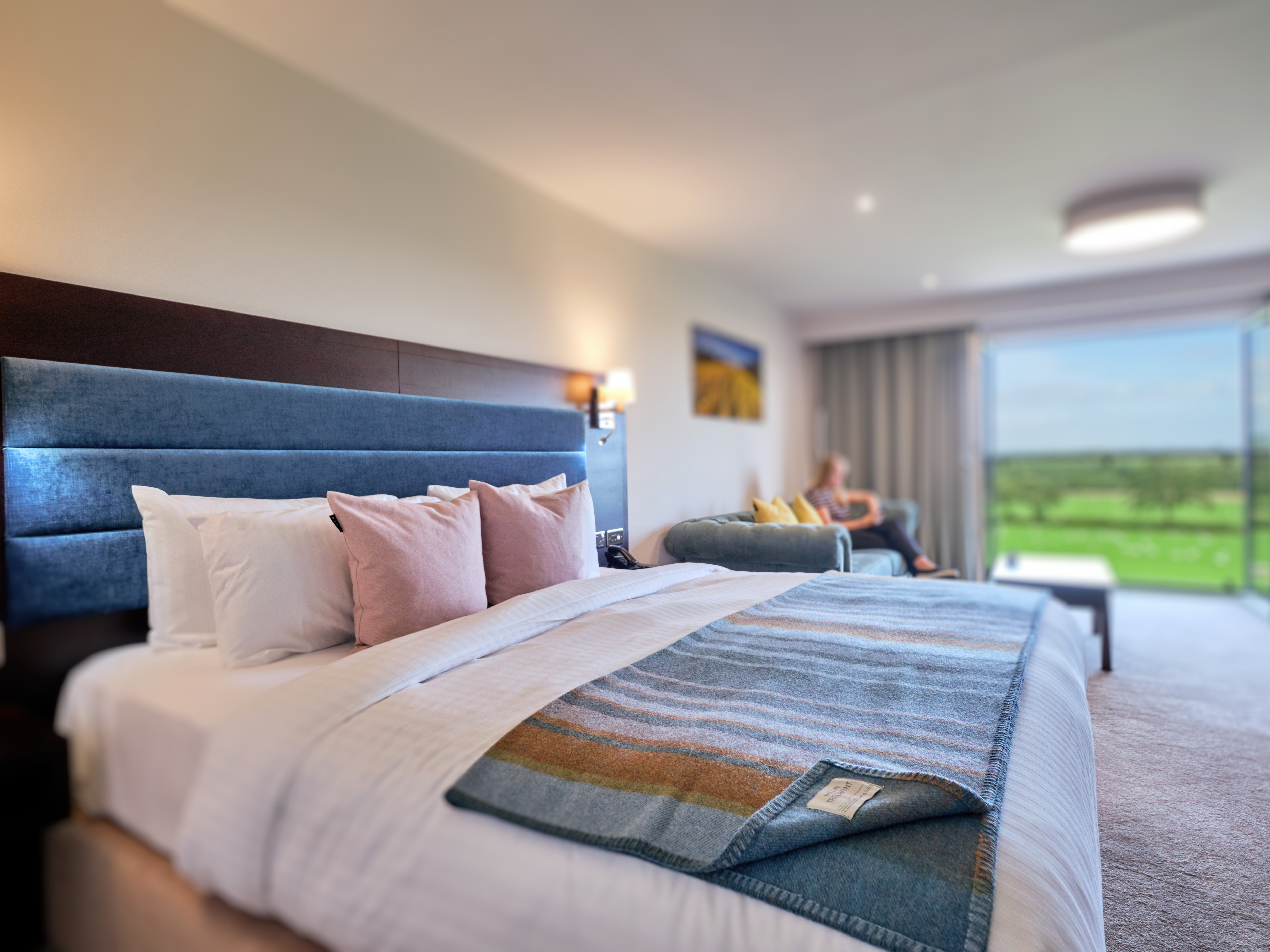 Unwind in a spacious room featuring a Respa super king-sized bed with premium linens and a Melin Tregwynt wool blanket. The elegant layout includes a Chesterfield sofa, seating area, and climate control for your comfort.