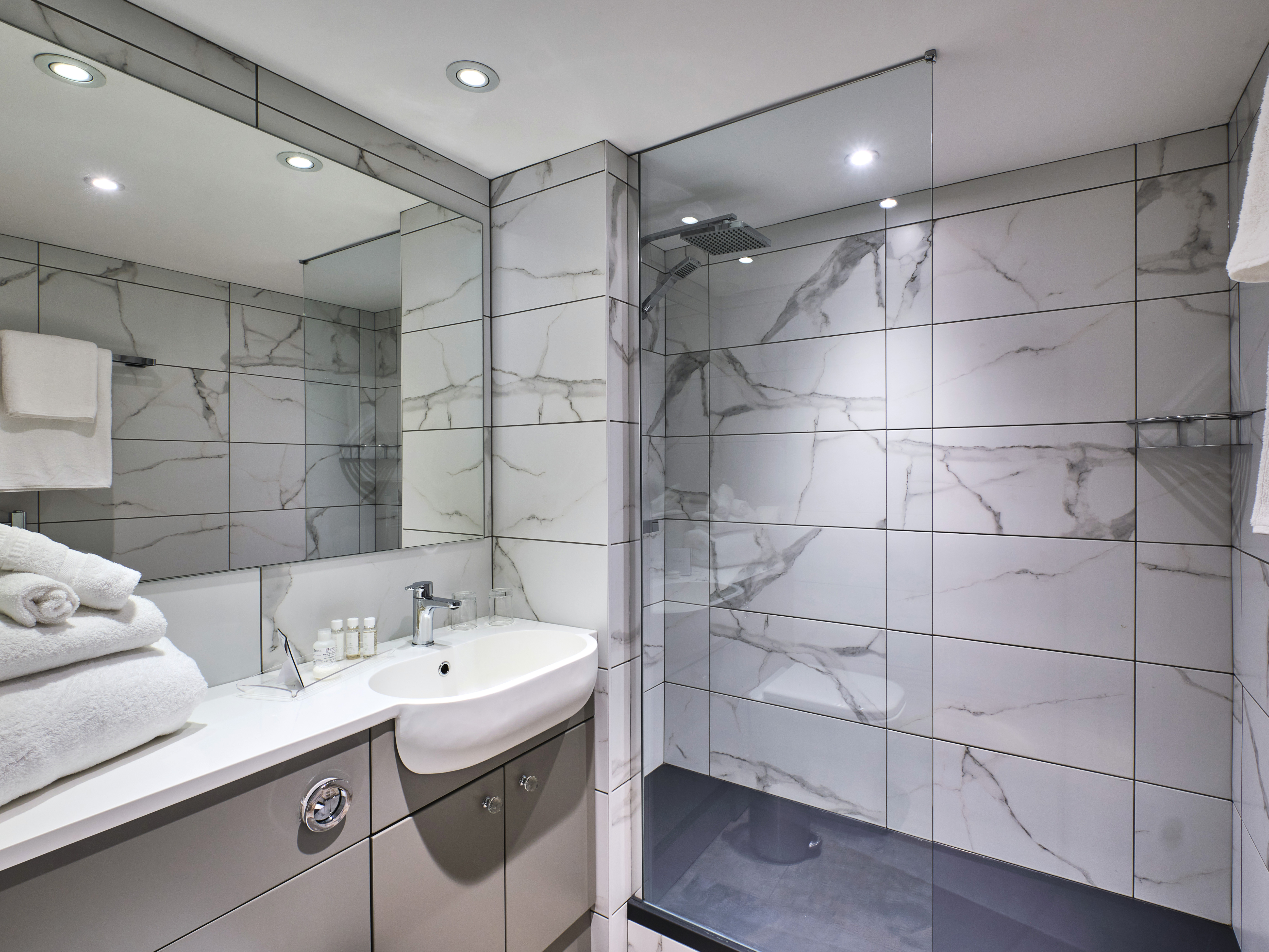 Indulge in a spa-like experience with our lavish walk-in shower, complete with complimentary toiletries and plush towels. Please note that our Courtyard Rooms do not feature a bath.